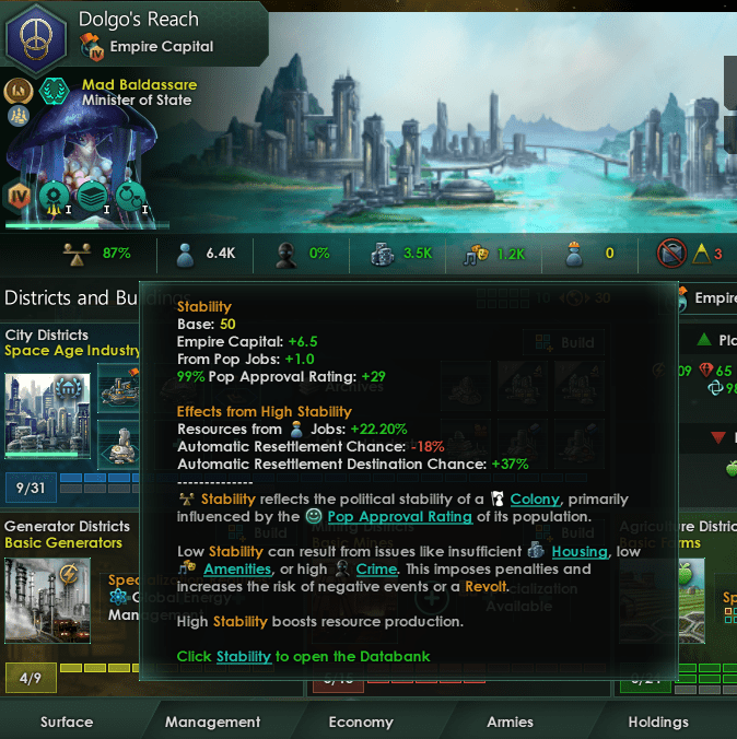 Neither one of these terms are described or discussed in game but basically a high stability makes it less likely for the population of this planet to resettle and more likely for it to be the destination to resettle. This makes sense. You might expect pops to move between worlds in a similar manner to how they migrate in world, with the best places (Ocean Paradise with Consumer Goods distributed) being a destination for pops living in low habitability. This is not true. The only pops that move automatically in Stellaris are civilians and unemployed pops in the other stratas. Per early dev diaries it appears like, for performance reasons, civilians target an empire to move to in step one and move to the capital, then in step 2 move to the desired planet. Testing this is kinda outside the scoop of this article.