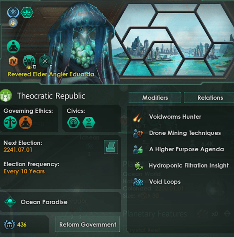 Shortly after one of the 4.xx patches I had wanted to play around with an ascension focused civilian build on an ocean paradise. My goal was to create a utopia and convert every species to ocean dwelling through the power of song deluge colossal weapon. I wanted to provide a home for all species and make sure they could travel and migrate to my ocean paradise. From the start I had a policy of Utopian Abundance for all citizen species.