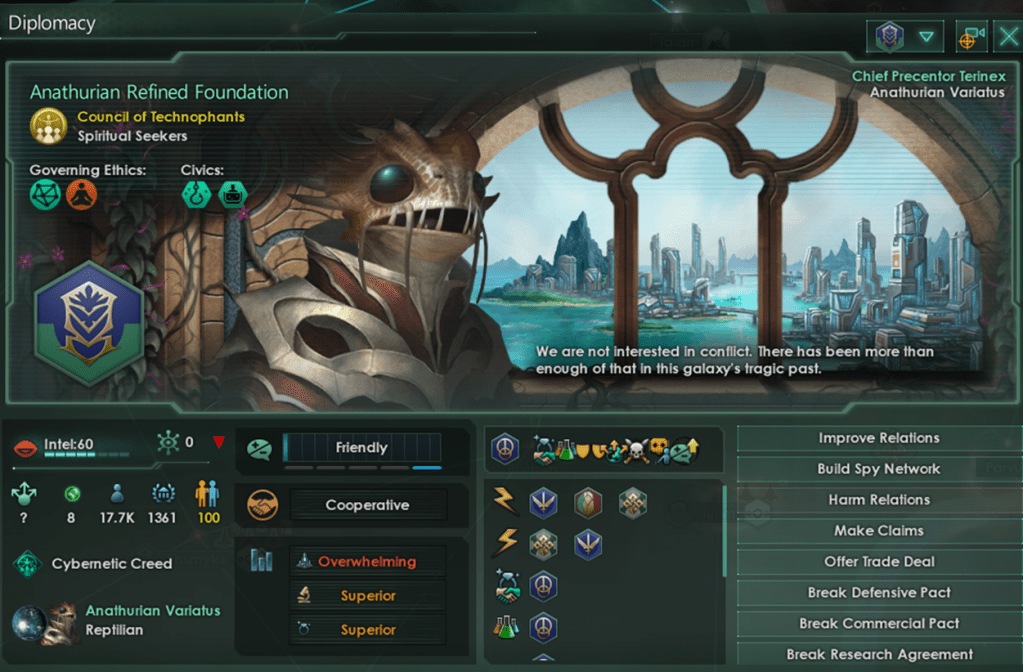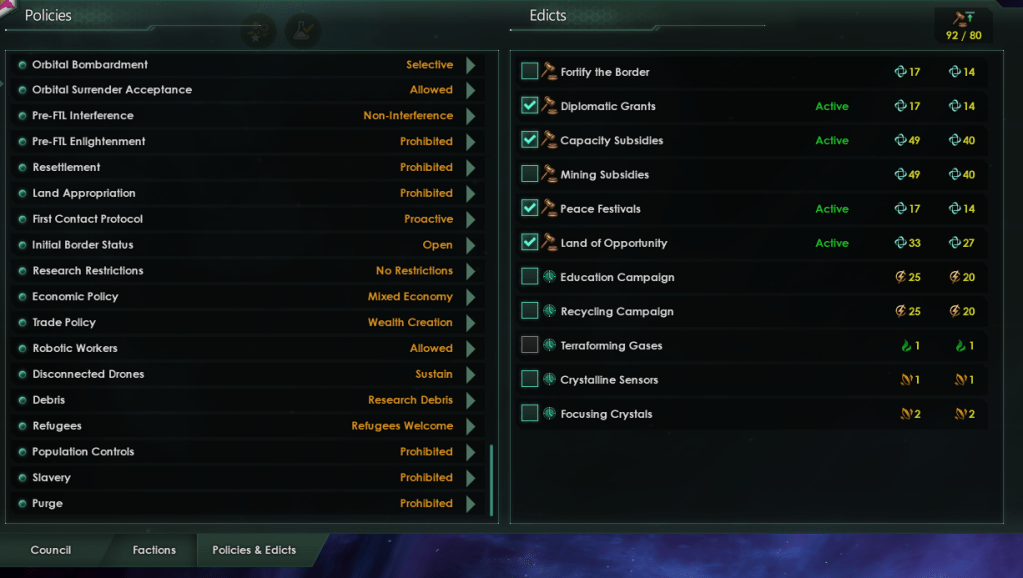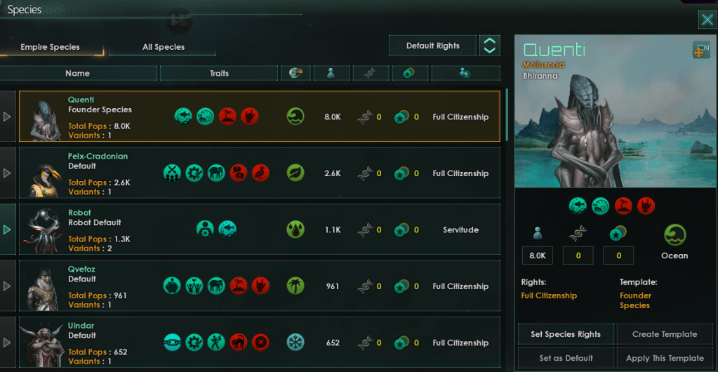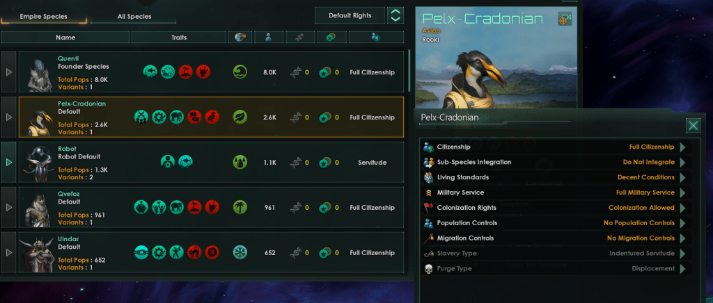 So with all of this knowledge if you’re seeking to create a multi-species empire full of species willing migrants and keep your own population the “best build” isn’t focused on rights and the conditions of your population. There are three important factors you can focus on to attract new pops as part of migration treaties.