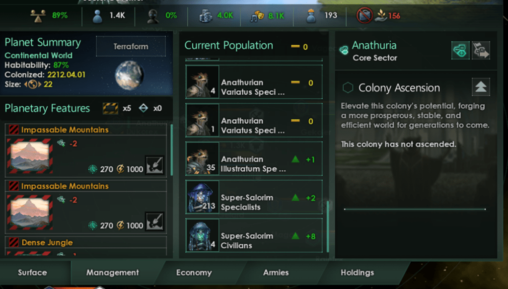 Even worse, my aquatic Salorim were migrating to a continental world from an ocean paradise. I was providing the highest possible living standard in the game and didn’t have any other negative controls.