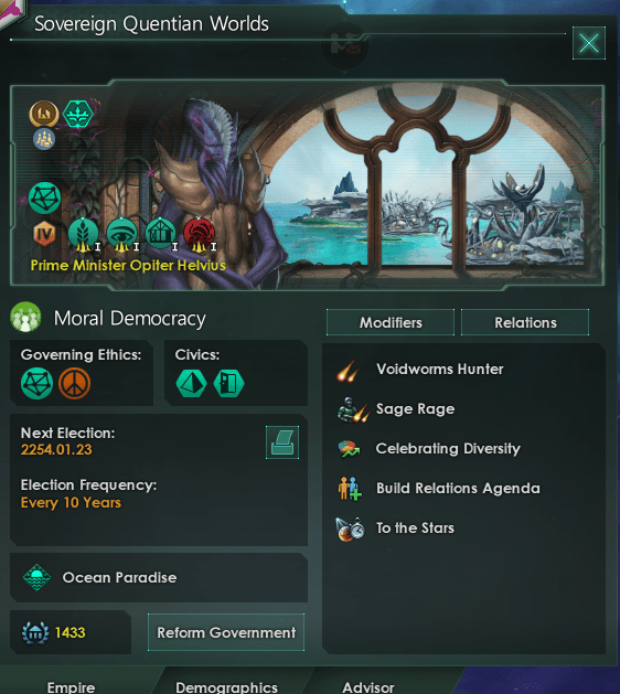 Instead of focusing on things like species happiness and amenities you’re going to focus on building labor camps coworking spaces that provide what all pops in the universe want employment. Functional Architecture and Prosperity become a much more important Civic/Tradition set to increase the speed that you can build new housing and worksites compared to Harmony, egalitarian ethics, or even Free Haven (the automatic resettlement civic). Even things like living standards and being a xenophile don’t impact migration from other species. I tested out two empires to prove that there are some counterintuitive factors at work in migration treaties in Stellaris. First, the nice guys – Sovereign Quentian Worlds are a pacifist moral democracy that are a free haven with functional architecture. I worked to make friends with everyone and built 6 migration treaties with 5 active (more on that later).