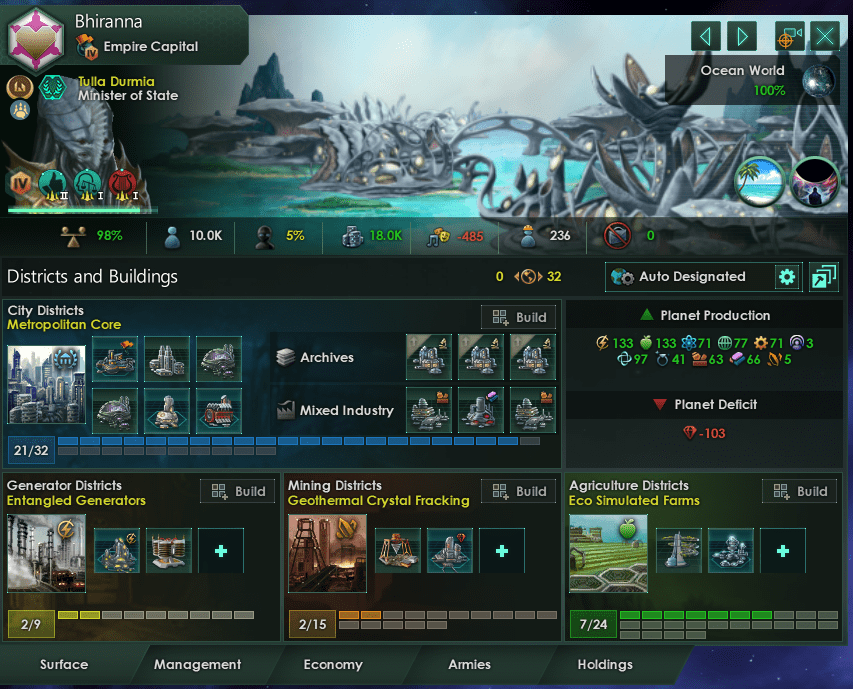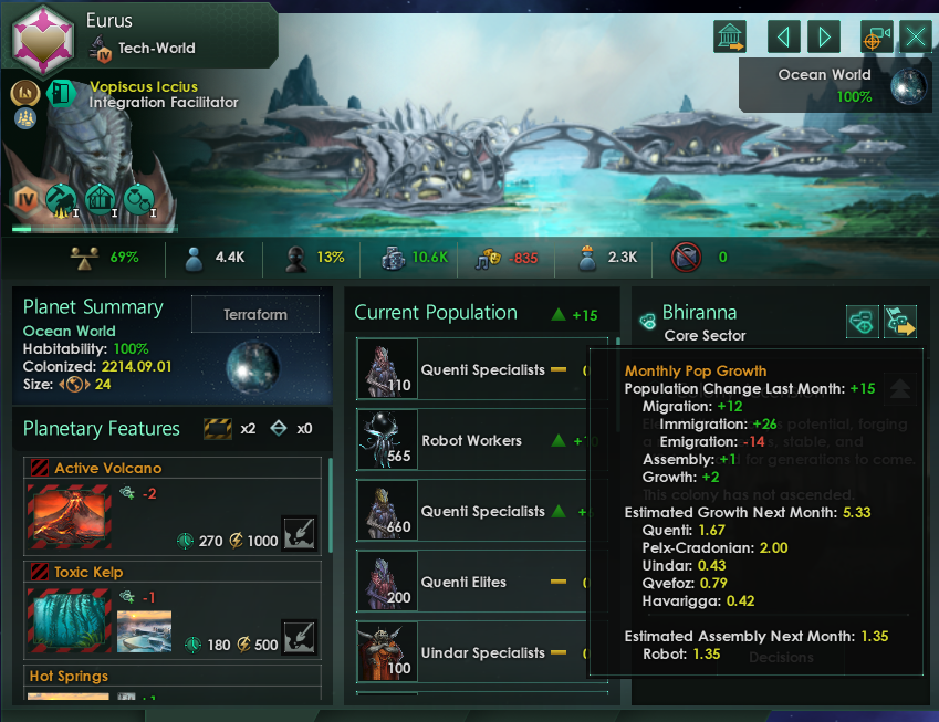 As the gallery above shows I haven’t lost a single member of my founding species despite having only ‘decent’ living standards. Once you understand that idle hands, not the automated dreadnaught, are what pops fear the most everything else in the universe falls into place. Even species like the Uindar, with artic preference, are begging to cross over and join my empire. As you can see the cities I’m offering them have negative amenities, high stability, and open housing and jobs.