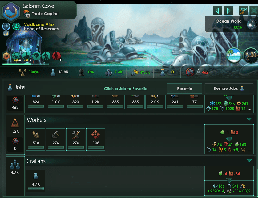 Of the five colonies I’ve planned I have one for alloys, one for physics research, one for engineering, and one general research. My dedicated trade planet is generating more than enough trade.