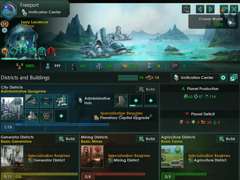 One temporary change I’ve made is creating a unity world called Freeport. Freeport is barely off the ground right now with just under 1K pops but will be my focus until I use planetary ascension on my planets to reduce my empire size. After this it will be turned into an alloy planet for producing more ships. Freeport represents a “win more” attitude and I’d likely quit without a streaming story and the cosmogenesis crisis path I’ve taken.