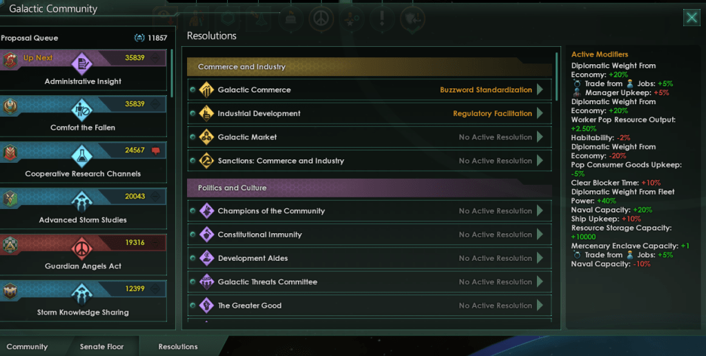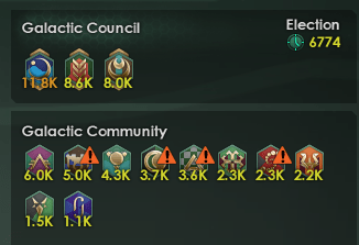 The Galactic Community hasn’t been off to a fast start with the majority of the resolutions related to fleet power. Since we’ve decided to become the crisis the only thing we are truly concerned with is keeping the community from attacking us as we accrue more power and knowledge.