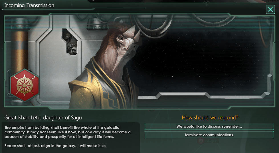 The galactic council has formed and we have a significant lead in diplomatic power. However, we’re far from being able to ram through any of the resolutions we want without friends and allies. As the crisis we can’t become the custodian so our plan is going to be to reduce the number of sets and make sure that we are the only member of the council.