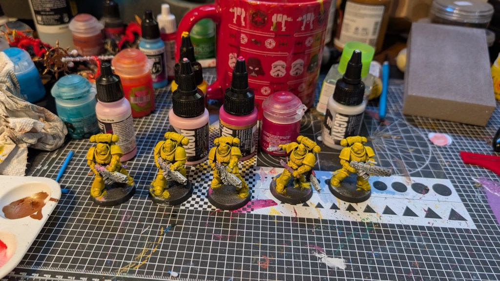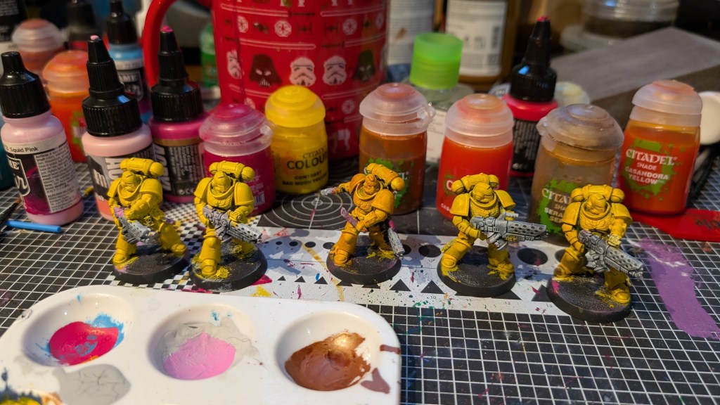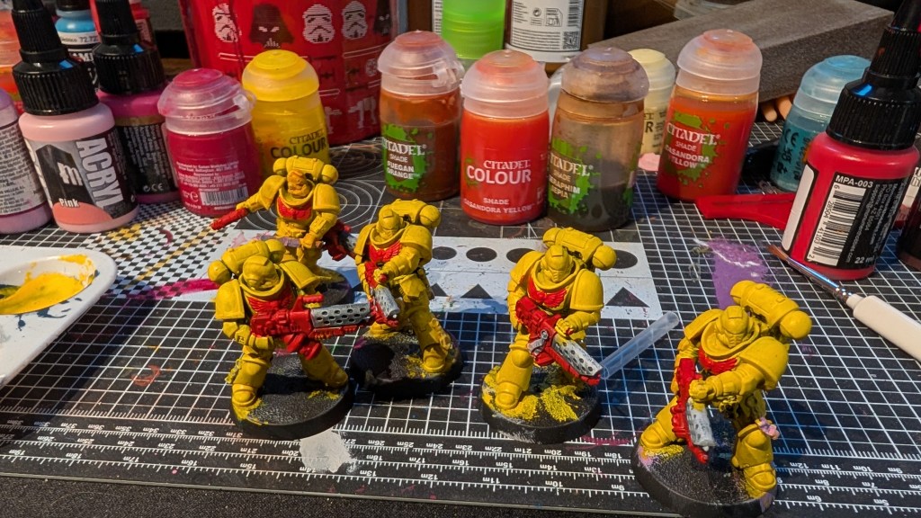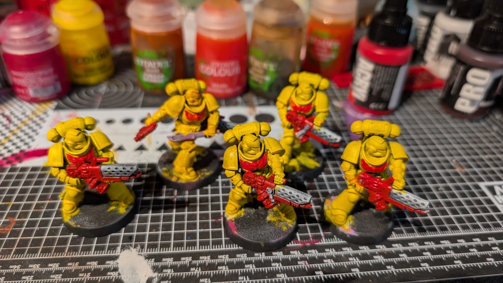 One of the biggest issues with painting an army is getting started. My son, a dedicated tyranids player, got a few boxes that included some extra space marines and I wanted to paint them. Instead of picking a lame blue or green or red I decided to attempt to paint yellow on a squad of infernus marines. They are not likely to be a core part of any army going forward and were safe to test. My goal with these models was to figure out if I could paint yellow.