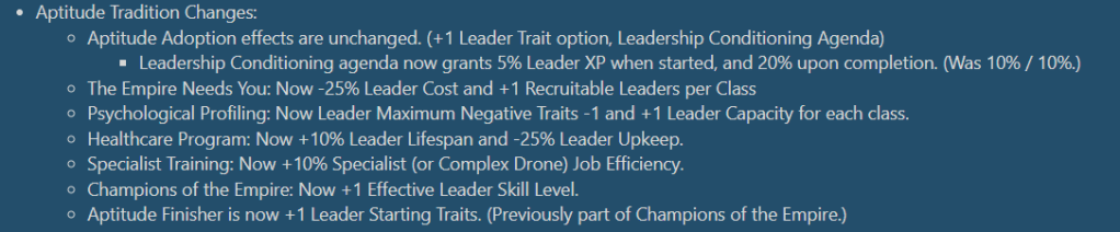 I really like Aptitude as a choice for my Jellyfish Empire and think the changes will play nicely. Adding 10% specialist job efficiency when “Most Job efficiency modifiers have been reduced” is extremely tasty. Additionally, the reduced leader upkeep is very good early game before you have enough unity generating planets to zoom through the traditions.